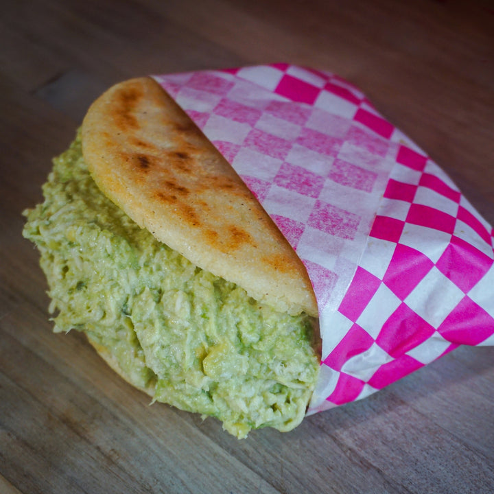 La Arepa Reina Pepiada es la reina indiscutible de las arepas venezolanas. Rellena con una mezcla cremosa de pollo desmechado, aguacate fresco y mayonesa, este plato ofrece una textura suave y un sabor único que conquista a todos.